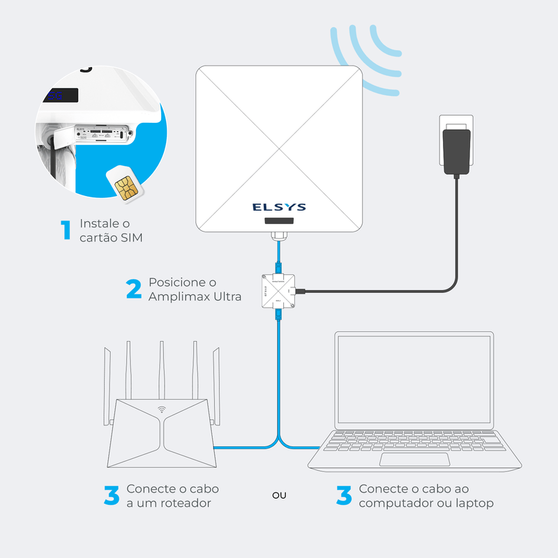 O Amplimax Ultra é um dispositivo de internet 5G com antena direcional de alto ganho, desenvolvido para captar sinal com mais alcance, velocidade e estabilidade em áreas com baixa cobertura.